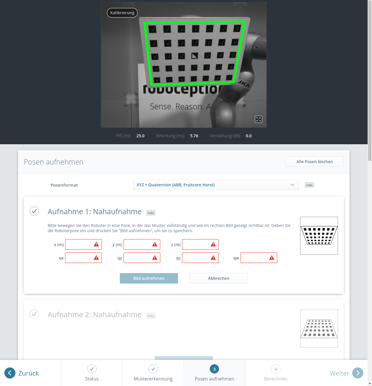 In der Web GUI kann der Nutzer zwischen vielen verschiedenen Formaten für die Kalibrierposen wählen (siehe Formate für Posendaten). Wird die Kalibrierung über die REST-API vorgenommen, dann werden die Kalibrierdaten immer im Format XYZ+Quaternion angegeben. Die Web GUI bietet acht Slots (Nahaufnahme 1, Nahaufnahme 2, usw.), in die der Benutzer die Posen manuell eintragen kann. Neben jedem Slot wird eine Empfehlung für die Ansicht des Kalibriermusters angezeigt. Der Roboter sollte für jeden Slot so bewegt werden, dass die empfohlene Ansicht erreicht wird.
