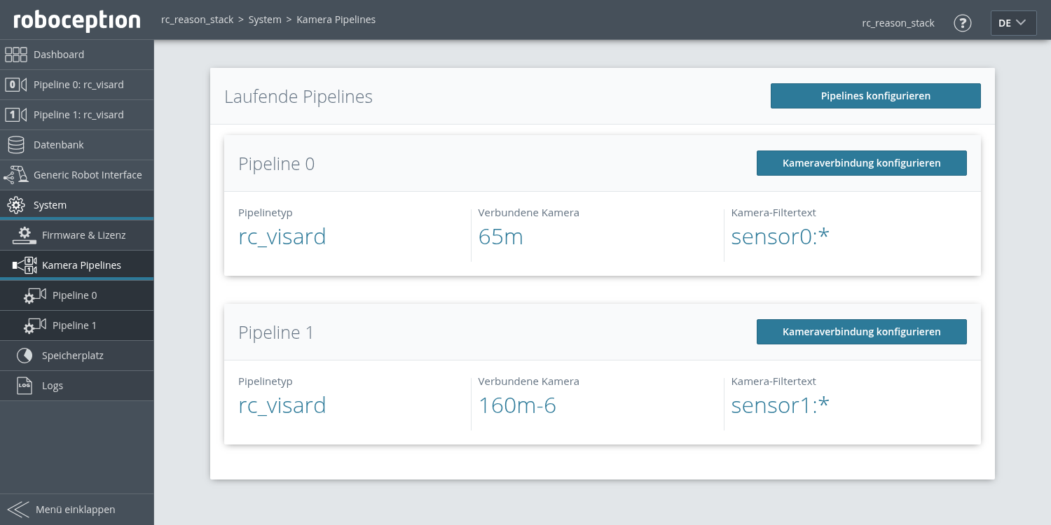 Abb. 3 Beispiel der Seite Kamera Pipelines auf einem rc_reason_stack mit zwei laufenden Pipelines vom Typ rc_visard
